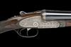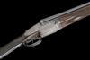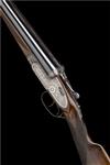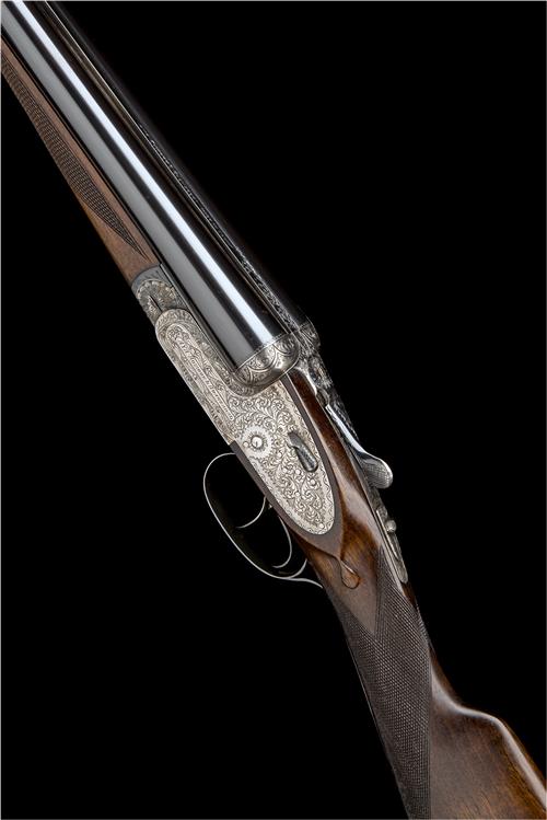 26in. nitro chopperlump barrels, 2 3/4in. chambers, bored approx. imp. cyl. and 1/2 choke, engraved arcaded fences, removable striker discs, automatic safety, hand-detachable lockplates, gold-inlaid cocking-indicators, articulated front trigger, rolled-edge triggerguard, acanthus scroll engraving, brushed bright finish retaining traces of colour-hardening, 15in. stock including 5/8in. rubber recoil pad, weight 6lb. 11oz., with a Croots canvas and leather slip