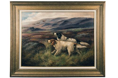 AN OIL ON CANVAS OF GROUSE OVER GUNDOGS IN A MOORLAND SETTING,