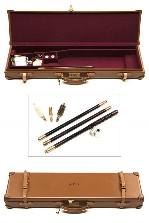 fitted for 28in. side by side barrels, the interior lined with maroon baize, a pair of 20-bore snap-caps, brush jag, mop, cleaning rod, oil, brass lock (including key), the lid exterior with the monogram 'A.D.S.'