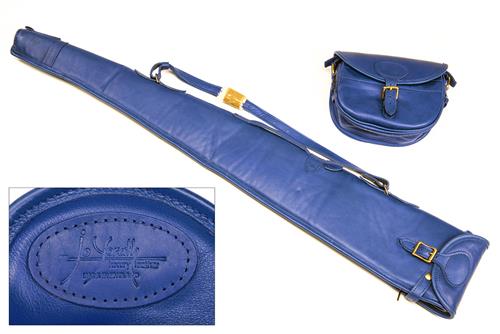 A VIRTUALLY NEW AND UNUSED BLUE LEATHER CARTRIDGE BAG AND SLIP SET,