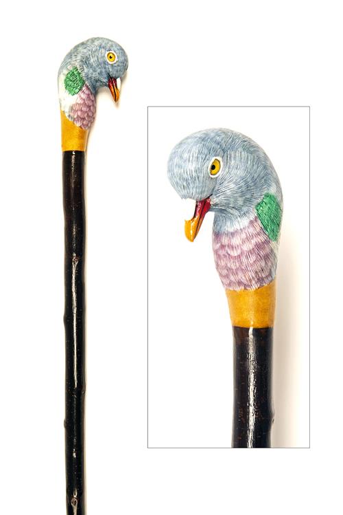 measuring approx. 58in. in length, hardwood shaft, brass ferrule, the head carved and painted in the form of a pigeon