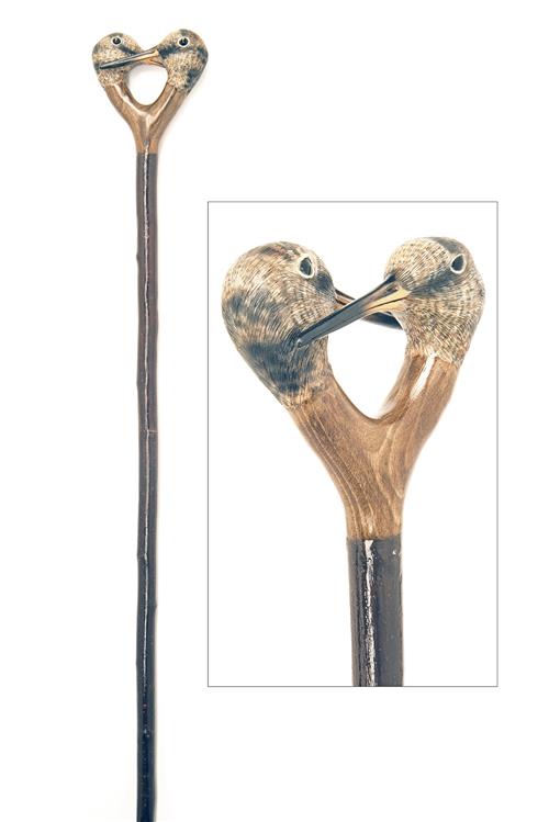measuring approx. 59in. in length with hardwood shaft, brass ferrule, the handle carved and painted in the form of the heads of two woodcock