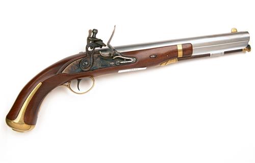 A REPRODUCTION .58 FLINTLOCK STAINLESS PISTOL SIGNED PEDERSOLI, MODEL HARPERS FERRY, serial no. 87702,