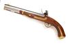 A REPRODUCTION .58 FLINTLOCK STAINLESS PISTOL SIGNED PEDERSOLI, MODEL 'HARPERS FERRY', serial no. 87702, with round 10in. rifled barrel, colour hardened lock, walnut half-stock and brass furniture, the whole appearing little used