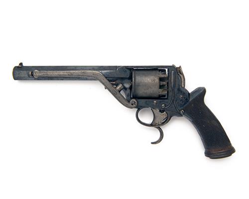 circa 1853, with blued octagonal 6 1/8in. barrel, dove-tailed blade fore-sight, standing notch rear-sight to the border and scroll engraved top-strap, engraved band to muzzle, the top-strap also signed 'J. ERSKINE NEWTON STEWART', scroll engraved barrel-throat, borderline engraved five-shot cylinder with rope-twist milled band to leading edge, borderline and scroll engraved solid frame with spurless hammer and fitted with Tranter's patent trigger-cocking mechanism, chequered swept walnut saw-handled grip, moulded and engraved iron butt-cap and detachable solid rammer mounted to the left hand side, strong amount of original finish throughout and complete with its walnut storage case lined and compartmented in green baize and containing a full suite of associated accessories including a bag-shaped flask, matching number mould, tins for caps, lubricating compound and bullets, a cleaning rod, oil-bottle, nipple-key and spare nipples