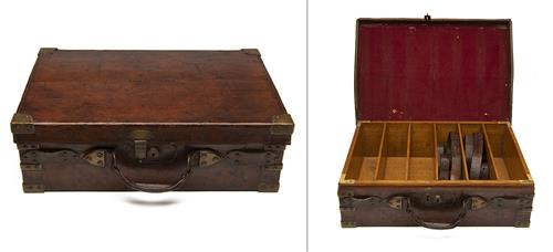 A BRASS-CORNERED OAK AND LEATHER CARTRIDGE MAGAZINE,