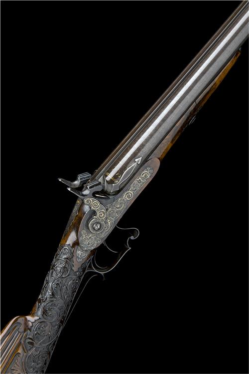 circa 1855, with browned damascus 30 1/2in. barrels, carved arabesques to the sides of breech, scroll engraving to rib-end and traces of gilt scroll-work to the tops of the breech, complex bordered broad top-tang engraved with scrolls and inlaid in gold with a bolting rabbit, complex bordered hump-backed scroll engraved bar-action locks further enhanced with gilt scroll-work (some losses), carved, moulded and engraved hammers, walnut half-stock of 'Lazarino' style with relief carved acanthus scrolls in lieu of chequering at the wrist (age cracks to fore-end and above locks), iron heel-pate with central inlet safety plate marked 'J.H. RENKIN AINE BREVETE No 103', locking button to toe, complex trigger-guard with grip-safe attached to lower tang, the whole scroll engraved with gilt inlays, en-suite ramrod throat, brass tipped ebony ramrod and plain pipes