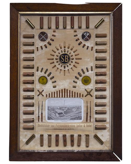circa 1900, measuring approximately 36in. high x 26in. wide including the bevelled wood frame (some damage to edges), the display area stepped and lined in off-white velvet, the outer stepped border displaying a comprehensive selection of paper and brass-cased shot-shells of both central and pinfire, the inner area displaying mostly metallic pinfire, rimfire and central-fire pistol cartridges together with various paper-cased garden-gun shells and igniter fuses all surrounding sunken wells of caps and primers along with a brass raised 'SB' trademark, two large cap-tin labels and a black and white depiction of the Sellier & Bellot factory at Schonebeck on the River Elbe (glazing cracked at corner)