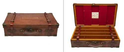 for approx. 500 cartridges, the lid interior lined with red baize, a Cogswell & Harrison trade label, three oak horizontal removable dividers, brass lock (key missing), the lid exterior with 'MARC PECHENART'