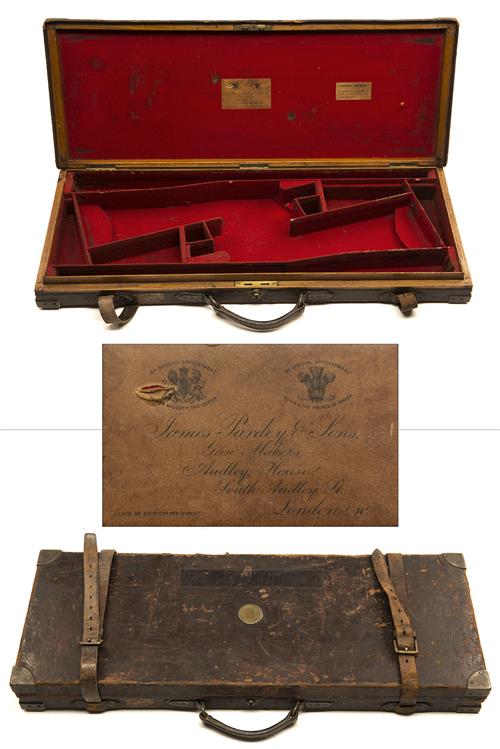 JAMES PURDEY & SONS A BRASS-CORNERED OAK AND LEATHER DOUBLE GUNCASE,