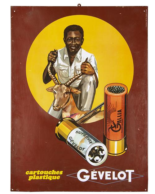 circa 1970, measuring approximately 22 3/4in. high x 16 3/4in. wide and featuring an African boy with a trophy Impala within a yellow circle on a brown ground above depictions of two shotgun cartridges, one of birdshot the other of buckshot, the lower edge with 'CARTOUCHES PLASTIQUE' and the Gevelot trademark