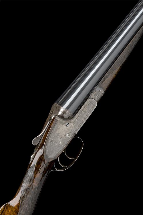 30in. nitro reproved chopperlump barrels, 2 3/4in. chambers, bored approx. true cyl. and full choke, left wall thickness at 19, treble-grip action with hidden third bite, arcaded fences, automatic safety with gold-inlaid 'S' detail, gold-inlaid cocking-indicators, articulated front trigger, border engraving, 14in. figured stock including 3/4in. rubber recoil pad, weight 6lb. 12oz.