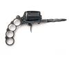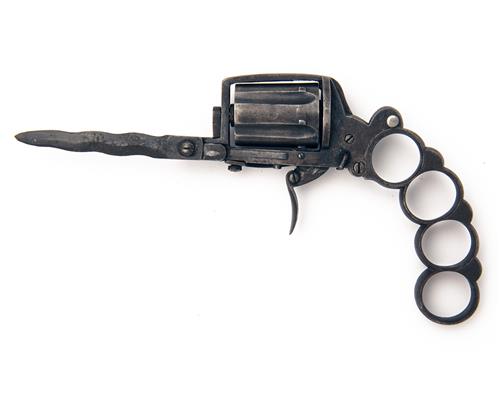 circa 1870, with fluted six-shot 'pepper-box' barrel group, solid iron frame with frontal cylinder release, extension piece to front lower frame signed 'L. DOLNE INV'UR', the left side mounted with a 3in. folding flambeau stiletto blade locking on a push-button catch, folding trigger and spurless hammer and folding curved iron grip comprising of four co-joined rings, slight traces of finish