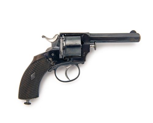 circa 1870, with blued octagonal 4 1/4in. barrel, radiused muzzle, solid top-strap thickened to allow for external ratchet indexing and signed 'C.H. GILKS & CO, TOWER HILL, LONDON', crescent fore-sight, sighting groove to top-strap, plain blued cylinder, cylinder arbor retained by a wing-nut, blued solid frame with external 'L' spring and signed 'W&S' with the 'winged bullet' trademark, polished double-action hammer and trigger, chequered walnut butt of pocket model form with shallow hump to rear and iron butt-cap with centrally stored ejector pin, the whole retaining the majority of its factory blued finish
