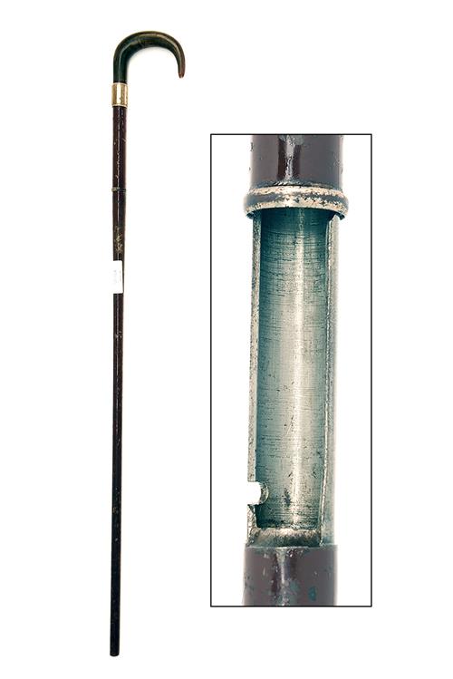 A .410 (2 1/2in.) WALKING-STICK SHOTGUN, UNSIGNED, MODEL 'DUMONTHIER'S PATENT' serial no. 987, with 27in, painted barrel, twist and pull action with concealed trigger in the band and crooked horn handle