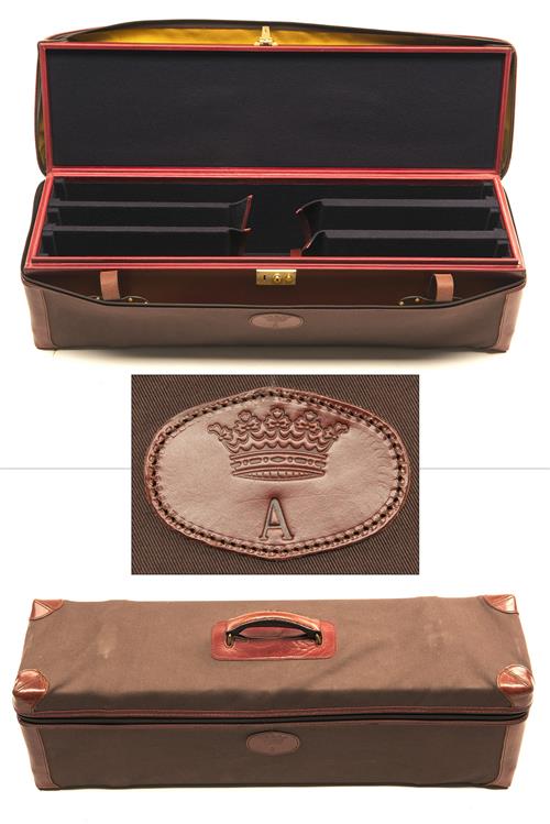 fitted for 29in. over and under barrels, the interior lined with blue baize, brass lock (key missing), canvas outer