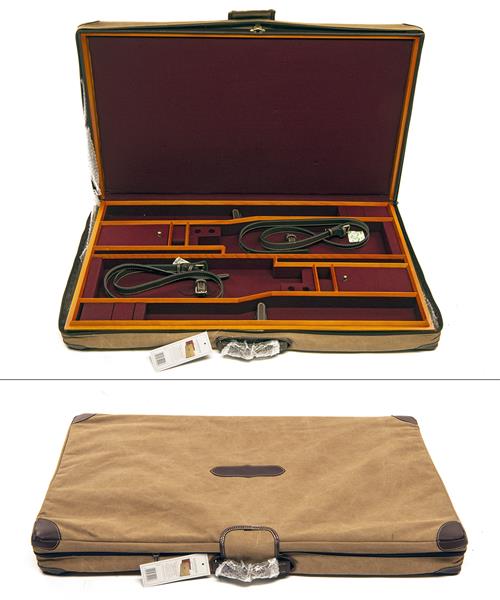 GUARDIAN LEATHER A NEW AND UNUSED BRASS-CORNERED OAK AND LEATHER PRESENTATION DOUBLE GUNCASE,