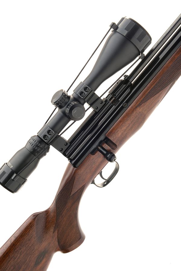 A .22 PRECHARGED PNEUMATIC AIR RIFLE SIGNED RWS, MODEL 'EXCALIBRE', serial no. 6528, with22 3/4in. barrel including detachable sound moderator, blacked receiver with bolt action operation and chequered walnut three-quarter stock