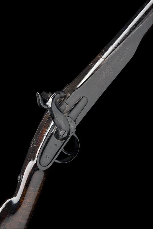 Belgian manufacture circa 1875, with tapering iron 47in. barrel, small dove-tailed fore-sight (missing bead), flush-fitting rebated breech-block with internal chamber hinging upwards from the front with rear hinge and nipple, an articulated locking lever securing it into battery and folding alongside the left hand side of stock, back action lock modified from a military lock-plate (remnants of a partial French arsenal signature), substantial iron top-tang, walnut butt-stock of oversized military form, moulded and shaped iron action body with integral tapering fore-end and rectangular aperture to the underside possibly for a mount, a further rebated section to the barrel just forwards of the fore-end, also believed for a swivel mount