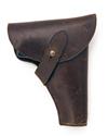 for 1907, with exposed 3 1/2in. barrel, crescent fore-sight, drift adjustable rear-sight, long extractor claw mounted in chamfered panel to right hand side of slide, blued iron frame with exposed broad hammer and lever safe, trigger with exposed bar link and retaining pin behind blade, chequered hard-rubber grips (right replaced, left cracked through), heel magazine release catch, strong amount of original finish, with a period full flap leather holster
