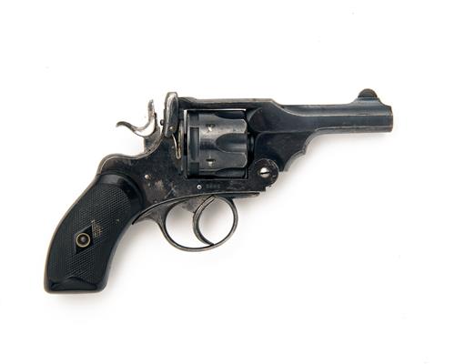 circa 1900, with 3in. blued barrel, integral blade fore-sight, the top-strap signed 'P. WEBLEY & SON, LONDON & BIRMINGHAM', stirrup locking catch, blued quick release auto-ejecting fluted cylinder, brushed bright ancillaries including flat-faced hammer with striker mounted in frame, chequered hard-rubber grips, much original blued finish
