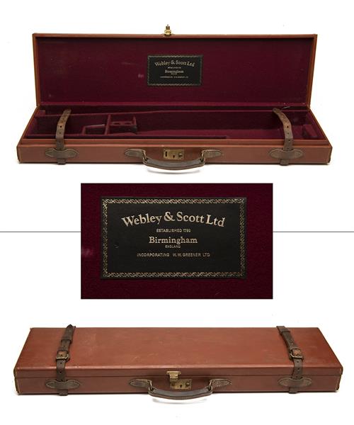 fitted for 28in. barrels, the interior lined with maroon baize, a leather Webley & Scott Ltd. trade label, brass lock (key missing)