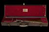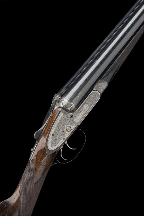 28in. replacement nitro chopperlump barrels (in 1974 by Purdey), the rib gold-inlaid '1' and engraved 'BARRELS BY J. PURDEY & SONS. AUDLEY HOUSE, SOUTH AUDLEY STREET, LONDON, ENGLAND.', 2 1/2in. chambers, bored approx. imp. cyl. and 1/2 choke, sideclipped action with arcaded fences, removable striker discs, toplever gold-inlaid '1', automatic safety (replacement toggle) with gold-inlaid 'SAFE' detail, protruding tumbler pivots with gold-inlaid cocking-indicators, fine border and acanthus scroll engraving, brushed finish, 14 3/4in. replacement stock, weight 6lb. 15oz., in a leather case