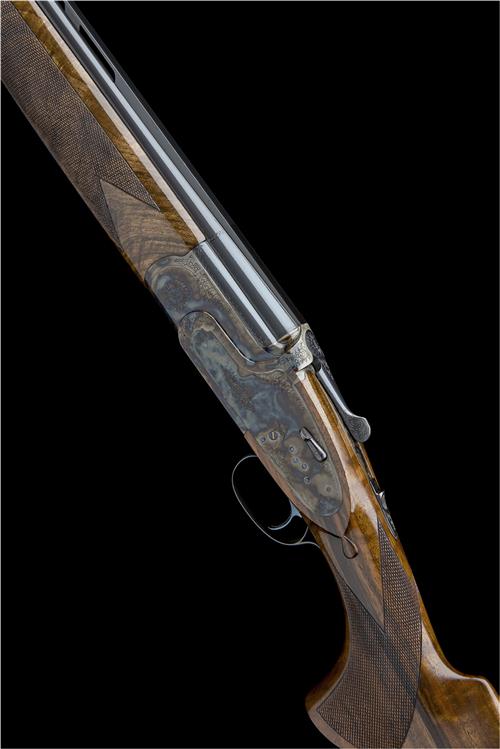 28in. nitro barrels (superior and steel shot proofed) with 10mm ventilated matt top-rib, ventilated mid-rib, 3in. chambers, multichokes (no spares), hold-open toplever, manual safety, hand-detachable lockplates with gold-inlaid cocking-indicators, border and acanthus scroll engraving, retaining full original colour-hardening and finish, the underside gold-inlaid 'WEBLEY & SCOTT',14 7/8in. figured pistolgrip stock including 1/2in. rubber recoil pad, weight 7lb. 7oz.