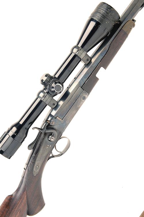 J. PURDEY & SONS .22 HORNET SINGLE-SHOT HAMMER ROOK RIFLE, serial no. 11142, 27in. a partially turned nitro tubed barrel (marked 'J. PURDEY & SONS 314 1/2 OXFORD STREET, LONDON' open sights missing, mounted with an un-named 10x40 telescopic sight, fine border and acanthus scroll engraving, top-lever, push-button release forend with horn , 14 1/8in. well-figured semi-pistolgrip stock with horn pommel, with cheekpiece, canvas sling