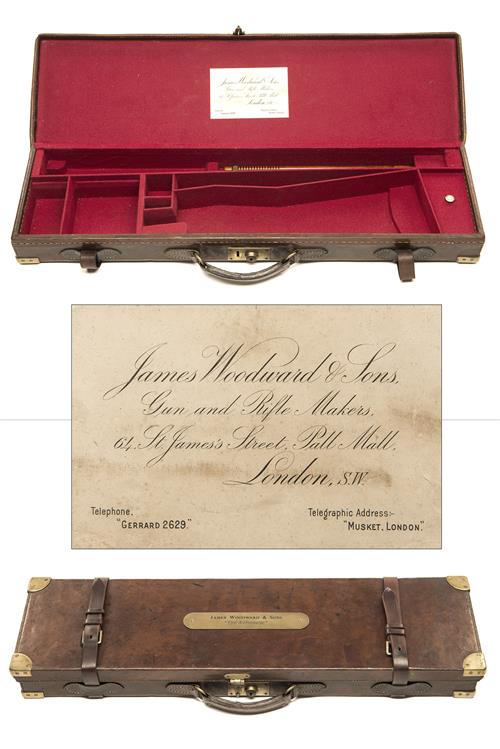 fitted for 29in. barrels (could adapt to 30in.), the interior re-lined with maroon baize, a James Woodward & Sons trade label, brass lock (key missing), the lid exterior with a brass plaque embossed with 'JAMES WOODWARD & SONS 'THE AUTOMATIC'