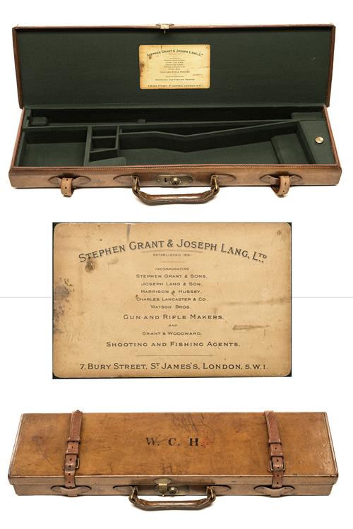 fitted for 28in. barrels, the interior lined with green baize, a Stephen Grant & Joseph Lang Ltd. trade label, brass lock (key missing), the lid exterior with the monogram 'W.C.H.'