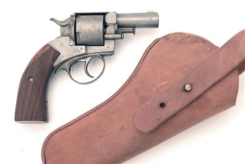 A .450 (BOXER) FIVE-SHOT REVOLVER SIGNED W. MORTON & SON, LIMERICK, MODEL 'WEBLEY No2 BULLDOG', serial no. 736, with ovoid 2 3/8in. barrel, solid frame, plain cylinder and replacement chequered walnut grip (frame lengthened), grey finish, with a later leather holster