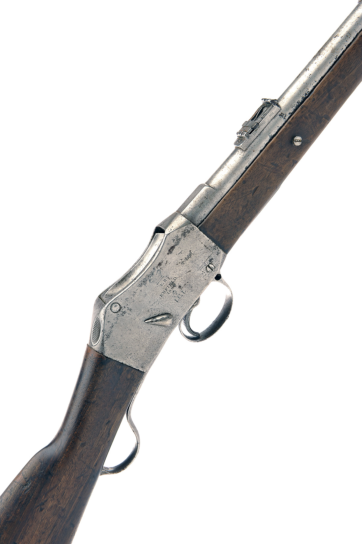A .577-450 (M/H) BREECH-LOADING CARBINE SIGNED ENFIELD, MODEL 'MARTINI-HENRY CAVALRY CARBINE', serial no. 369, with 21 1/2in. barrel, slab-sided receiver with walnut butt-stock, full length fore-end, moulded iron nose-cap , complete with clearing rod, finish worn