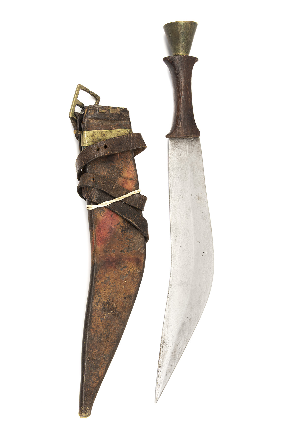 * AN AFRICAN 'BILLA' TYPE KNIFE, late 19th century, probably from the region of Somalia, with curved and pointed 13in. blade, carved wood handle and flaring hollow brass cup pommel, complete with its leather scabbard