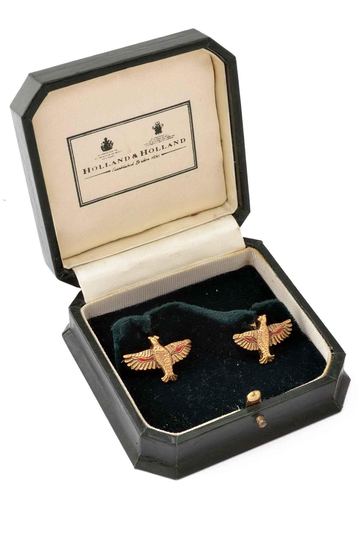 HOLLAND & HOLLAND A PAIR OF GILT AND ENAMEL FLYING BLACK GROUSE CHAIN-LINK CUFFLINKS,