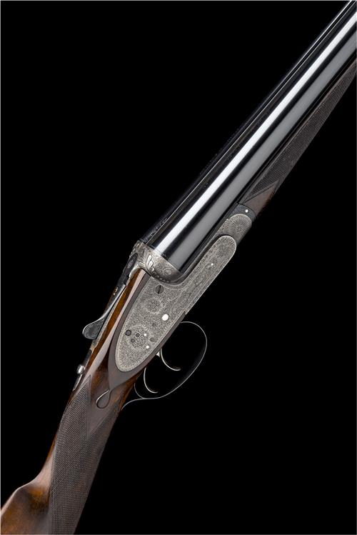 28in. replacement nitro barrels, the tubes engraved 'NEW BARRELS FITTED BY HENRY ATKIN. LTD. 27. ST JAMES'S ST. LONDON. S.W.', 2 1/2in. chambers, bored approx. imp. cyl. and full choke, carved leaf fences, toplever gold-inlaid '2', automatic safety with gold-inlaid 'SAFE' detail, fine bouquet and acanthus scroll engraving, the makers name in central scrolling banners, brushed finish, pins reblued, the underside engraved ''BEESLEY'S PATENT', 14 1/4in. replacement stock, weight 6lb. 7oz., in a canvas and leather case