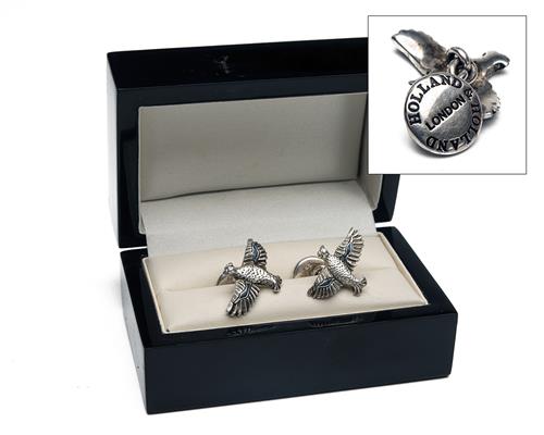 HOLLAND & HOLLAND A PAIR OF STERLING SILVER AND ENAMEL FLYING BLACK GROUSE CHAIN-LINK CUFFLINKS,