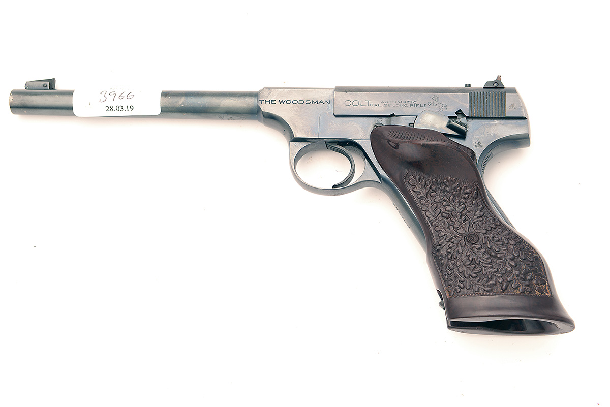 A .22 (L/R) SEMI-AUTOMATIC PISTOL SIGNED COLT, MODEL 'THE WOODSMAN', serial no. 156588, for 1942, with blued tapering 6 1/2in. sighted barrel, blued slide, blued frame and florally embossed bakelite anatomical grips, much original finish remaining