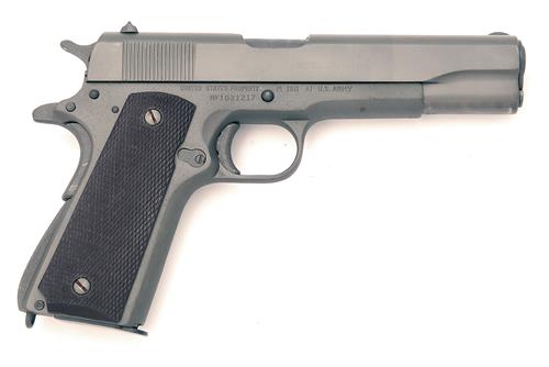 A .45 (ACP) SEMI-AUTOMATIC PISTOL , UNSIGNED, MODEL '1911A1 TYPE', serial no. 1021217, with possible Colt frame marked 'UNITED STATES PROPERTY', later slide and barrel, chequered brown plastic grips and finished in grey phosphate
