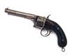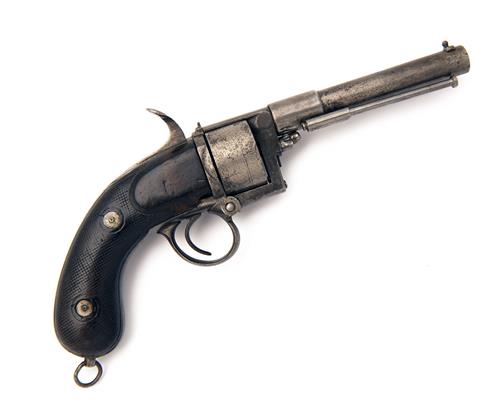 Belgian circa 1860, with round iron 5 3/4in. barrel, the collar supporting the ejector rod rotating on the barrel operating a cam to unlock the front of frame allowing it to hinge down, plain cylinder, concealed boxlock action with off-set central partially exposed hammer, walnut chequered bag-shaped side-panels also forming the grips (chipped at right lower front corner), lanyard ring at heel