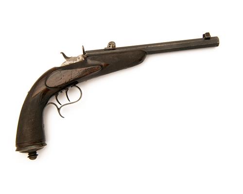 Belgian circa 1870, with blued octagonal 9 3/4in. barrel, dove-tailed fore-sight with additional side protectors, elevating tangent rear-sight, flip open breech with central hammer, concealed boxlock action, chequered walnut half-stock with pistol-grip finished with a colour hardened pommel-cap with central finial and double set triggers, strong amount of finish remaining