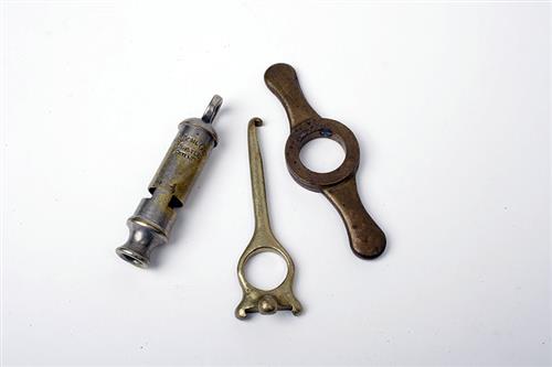 A COLLECTION OF VINTAGE BRASS SHOTGUN ITEMS, comprising of a 'THE HOME CITY PATENT' whistle, a 12-bore cartridge extractor / sizer, a Parker-Hale 12-bore sizer