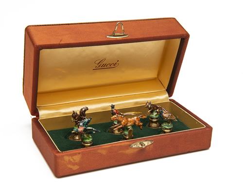 GUCCI A CASED SET OF SIX .925 SILVER GILT PAINTED PLACE CARD HOLDERS,