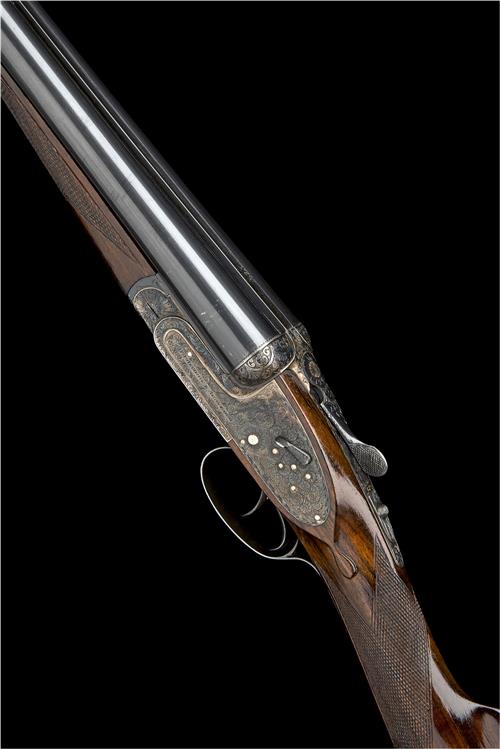 26in. nitro barrels, 2 3/4in. chambers, bored approx. true cyl. and 1/2 choke, removable striker discs, automatic safety with gold-inlaid 'S' detail, hand-detachable lockplates, gold-inlaid cocking indicators, articulated front trigger, rolled-edge triggerguard, border and acanthus scroll engraving, retaining some original colour-hardening and finish, 16 1/4in. stock, weight 6lb. 14oz.