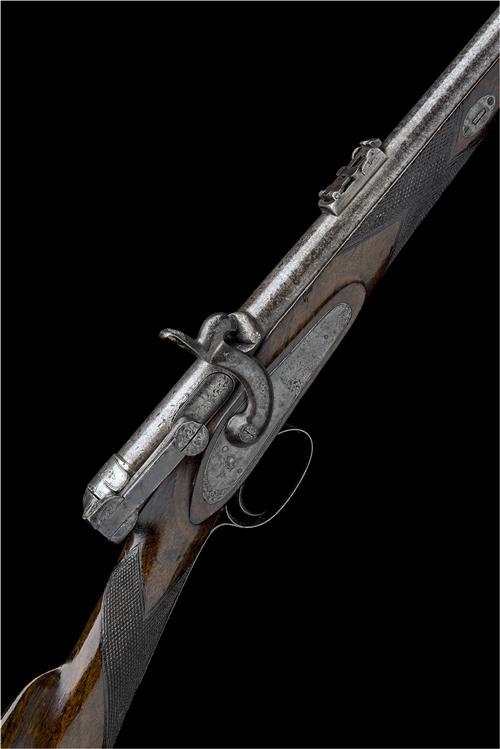 circa 1865, with 22in. barrel, block and blade fore-sight, ladder rear-sight, the rear of breech with traces of inscription 'TERRY'S PATENT 30 BORE', side mounted scroll engraved lift and twist bolt, borderline and scroll engraved lock signed 'CALISHER & TERRY, LONDON' (traces of colour), chequered walnut half-stock with iron furniture, single barrel key and eyelets for sling