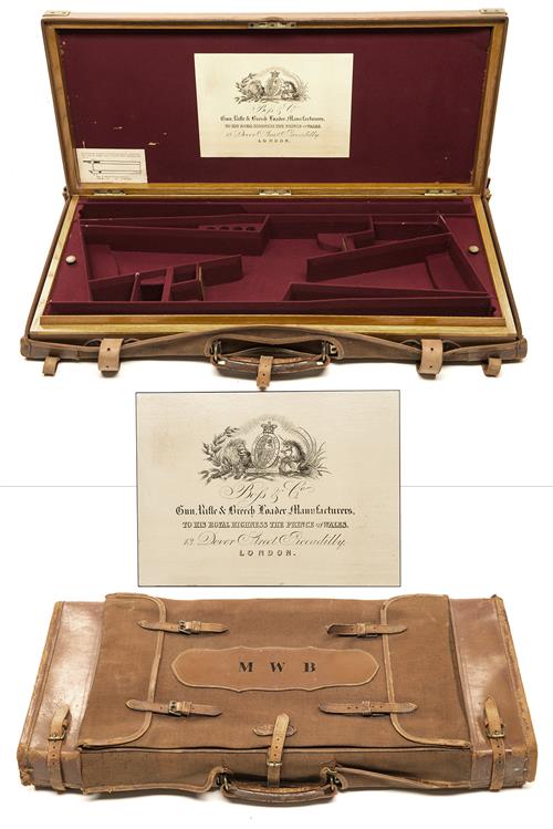 fitted for 28in. 20-bore over and under barrels, the interior lined with red baize, a Boss & Co. trade label, central brass push-button lock (including keys), with canvas and leather outer with central monogram 'M.W.B.'