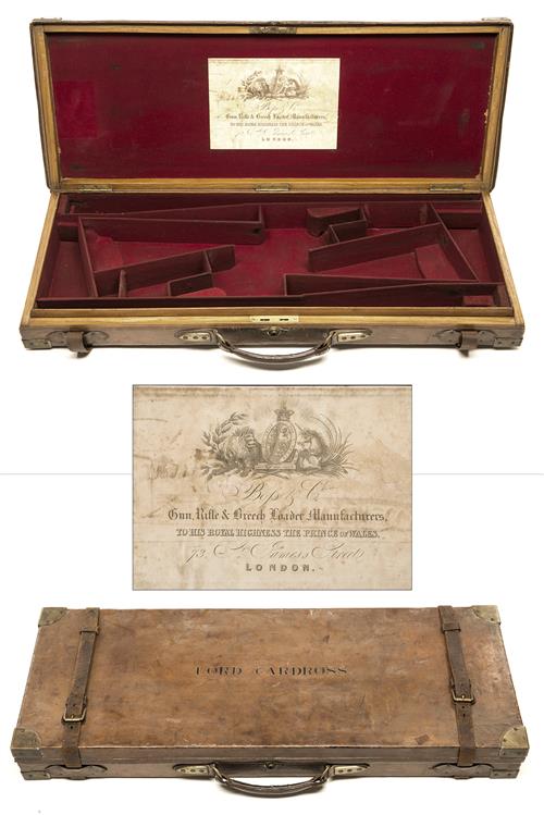 fitted for 30in. barrels, the interior lined with red baize, a Boss & Co. trade label, central brass push-button lock (key missing), the lid exterior embossed with 'LORD CARDROSS'