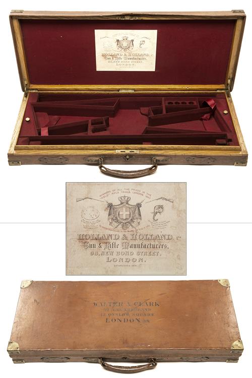 fitted for 28in. barrels, (could adapt to 30in.), the interior lined with red baize, a Holland & Holland trade label, central brass push-button lock (including key), the lid exterior embossed with 'WALTER A. CLARK OF CRUTHERLAND 12 ONSLOW SQUARE LONDON S.W.'
