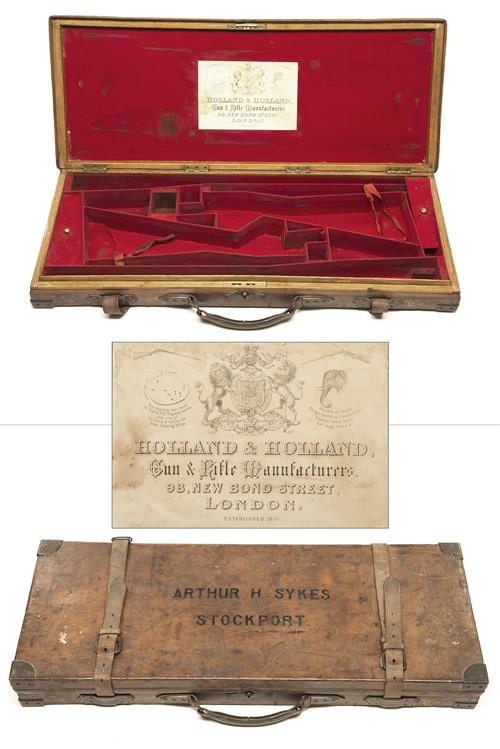 fitted for 30in. barrels, the interior lined with red baize, a Holland & Holland trade label, central brass push-button lock (including key), the lid exterior embossed with 'ARTHUR H. SYKES STOCKPORT'