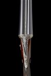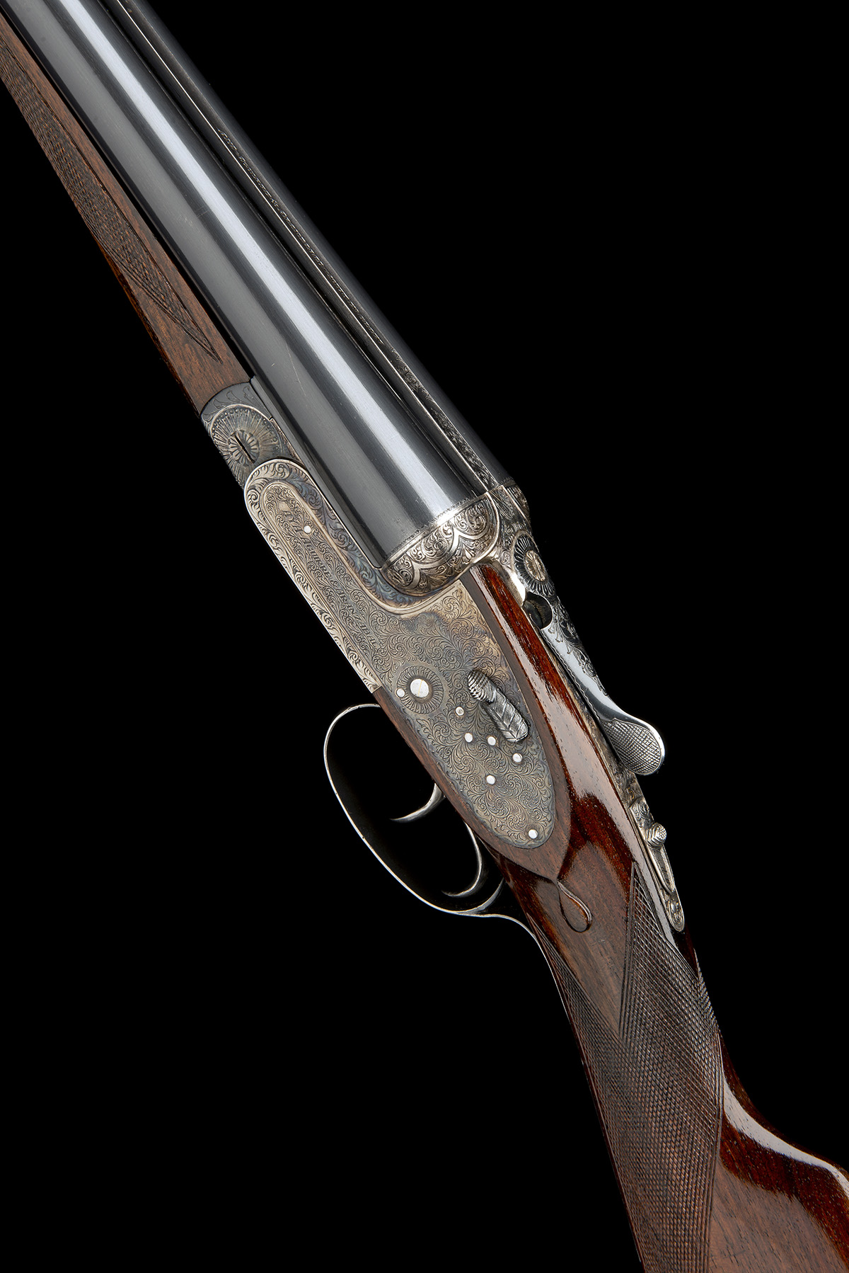 28in. nitro chopperlump barrels, 2 3/4in. chambers, bored approx. imp. cyl. and 1/2 choke, engraved arcaded fences, removable striker discs, automatic safety, hand-detachable lockplates, gold-inlaid cocking-indicators, articulated front trigger, rolled-edge triggerguard, acanthus scroll engraving, retaining traces of original colour-hardening and finish, 14 1/4in. stock, weight 6lb. 9oz.